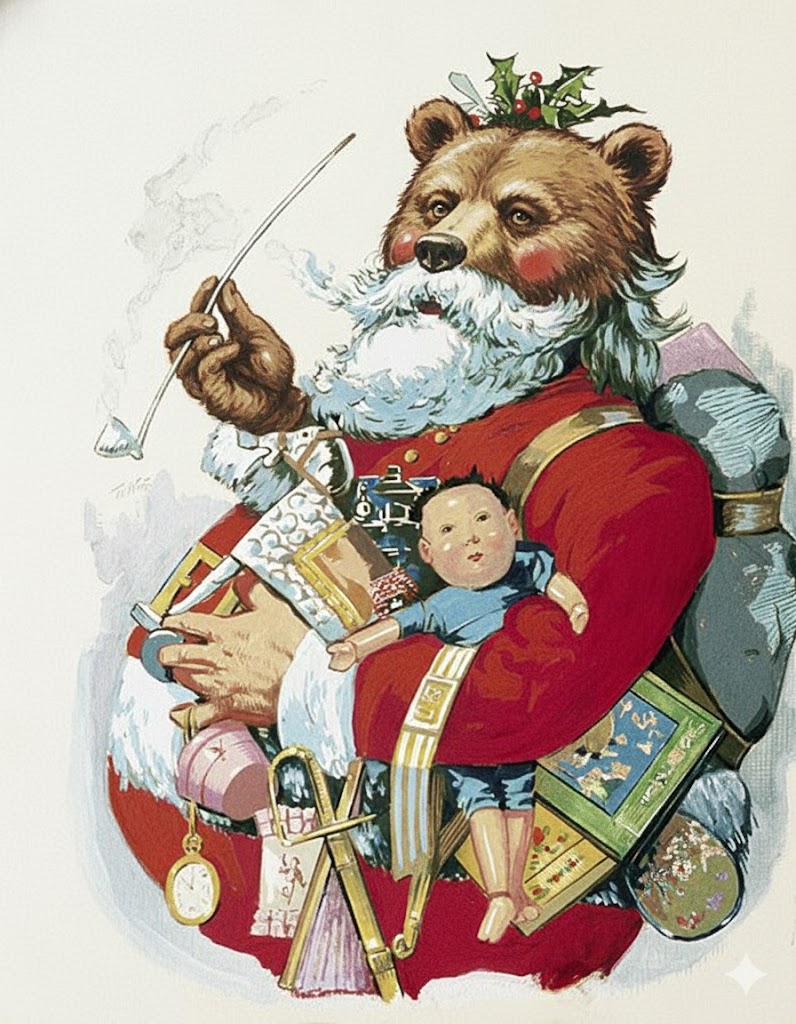 Probably that is what happened. She imagines a bear with a white beard and a long, red coat. That makes her chuckle and forget the danger. She slowly dozes away.